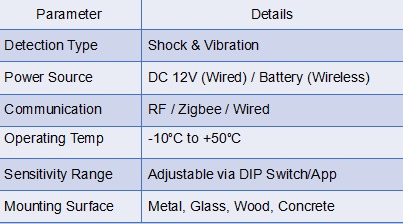 A smart sensor designed to detect vibrations caused by impacts, tampering, or break-in attempts on surfaces like doors, windows, safes, or walls.